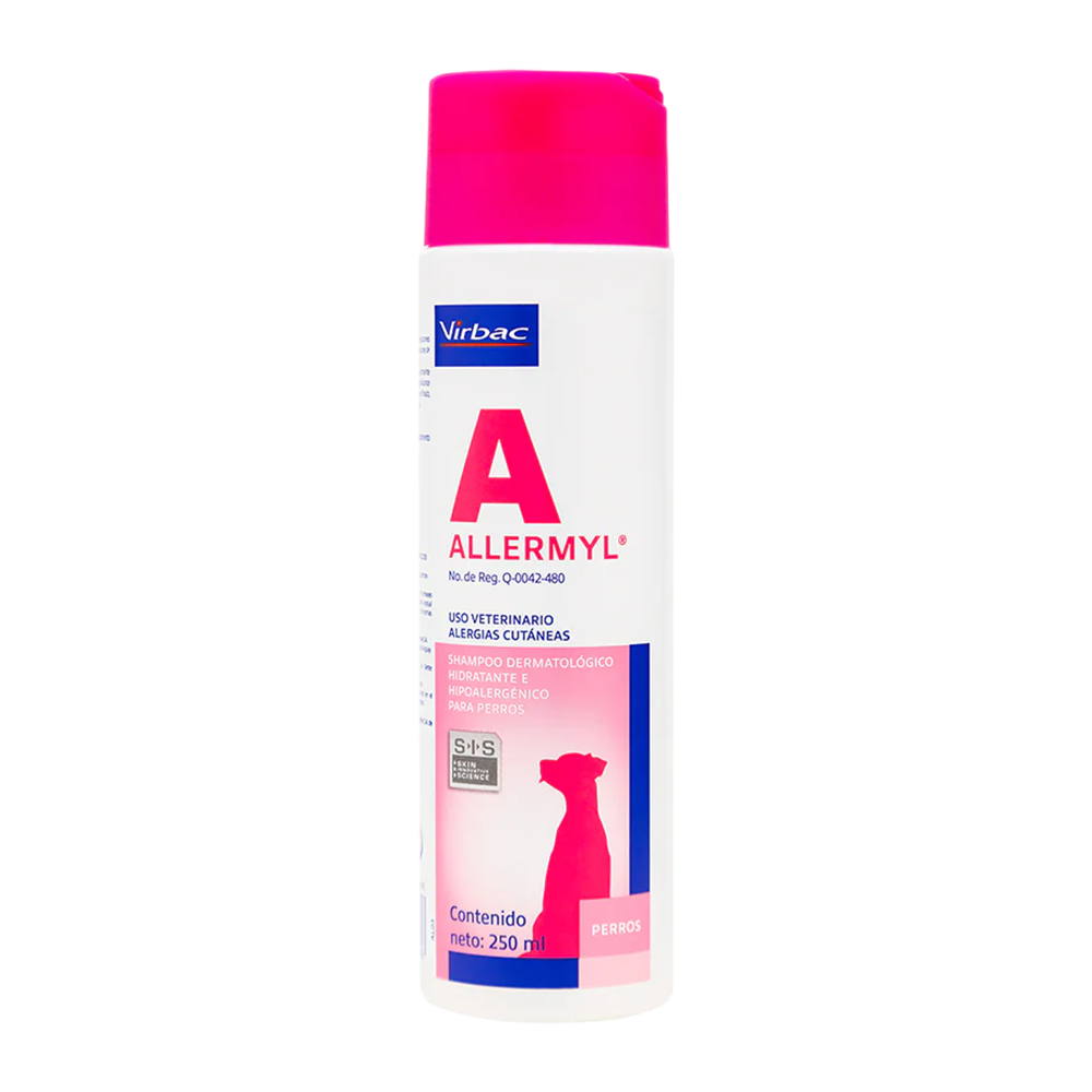 Shampoo dermatológico hipoalergénico para perros con alergias cutáneas.