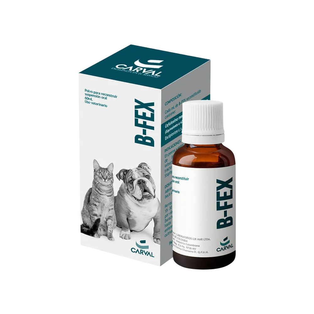B-Fex contiene cefalexina como antibiótico principal, eficiente para tratar infecciones de piel, tejidos blandos y vías urinarias en perros y gatos. Se reconstituye fácilmente para dosificación oral precisa.