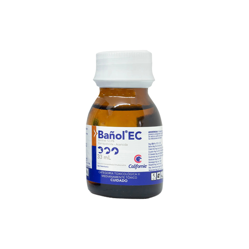 Bañol EC contiene amitraz, ideal para eliminar garrapatas, ácaros y otros ectoparásitos. Se diluye en agua y se aplica mediante baño o aspersión, bajo supervisión profesional.