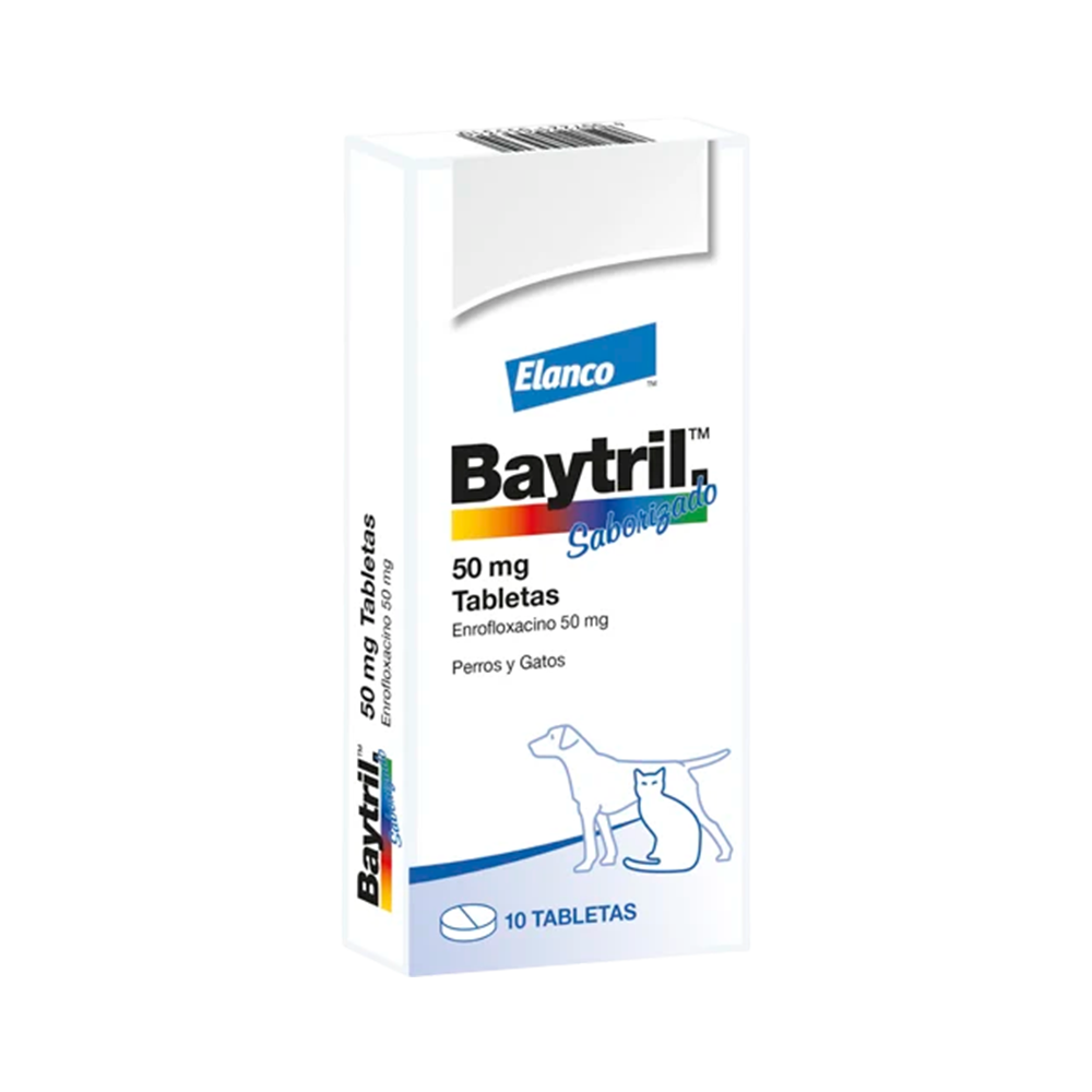 Baytril Saborizado de Elanco contiene enrofloxacino 50 mg, una fluoroquinolona de amplio espectro con sabor carne que facilita la administración oral en perros y gatos. Indicado para infecciones bacterianas del tracto respiratorio, urinario, cutáneo, gastrointestinal y tejidos blandos. Su presentación de 10 tabletas garantiza un tratamiento completo contra patógenos gram positivos y gram negativos susceptibles.