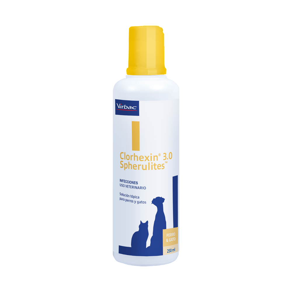 Clorhexin 3.0 Spherulites de Virbac es una solución dermatológica con tecnología de microencapsulación que libera gradualmente clorhexidina al 3% sobre la piel, proporcionando acción antiséptica prolongada contra bacterias y hongos. Indicada para piodermas, dermatitis bacterianas y fúngicas en perros y gatos. Su presentación de 250 mL permite aplicaciones repetidas en el tratamiento de infecciones cutáneas persistentes.