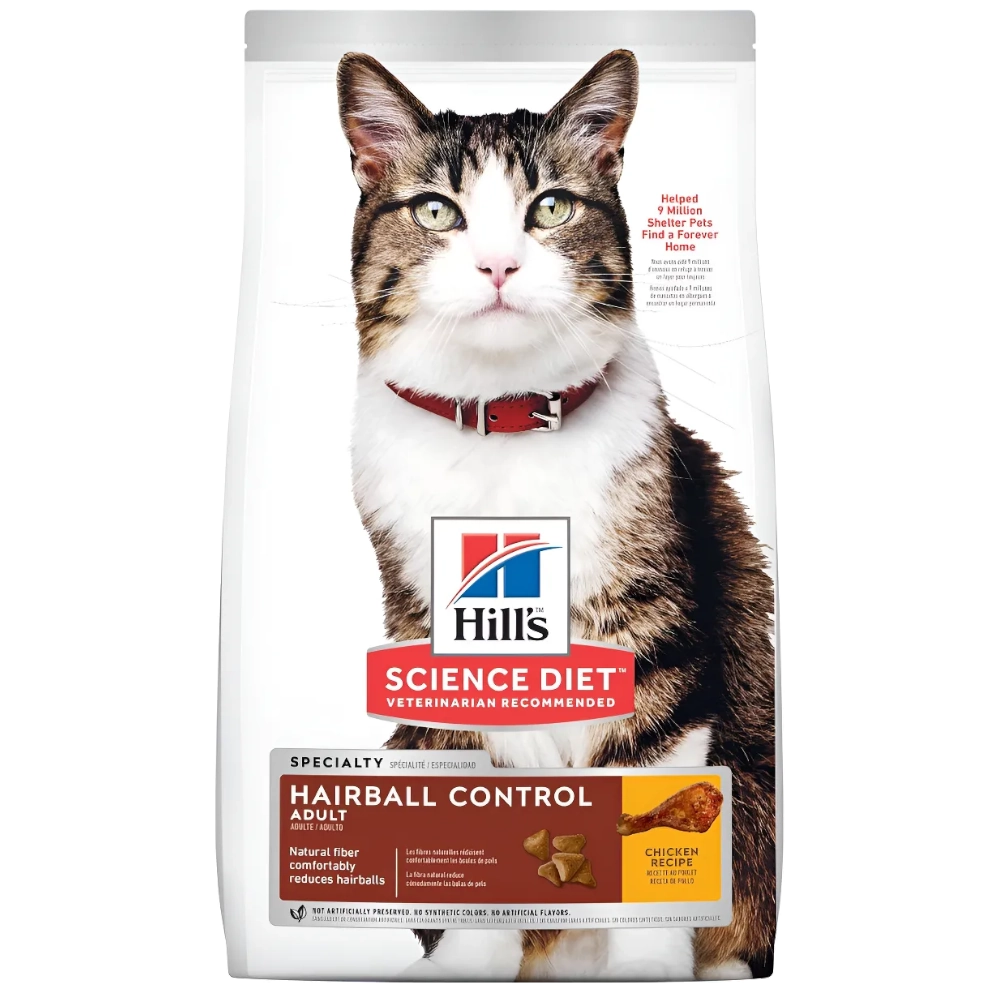 Alimento seco Hill’s Science Diet Hairball Control Adult 1.6 kg (3.5 lb) para gatos adultos. Formulado para reducir bolas de pelo, apoyar la salud urinaria y mantener músculos magros. Con delicioso sabor a pollo y mezcla de fibras naturales para un bienestar integral.