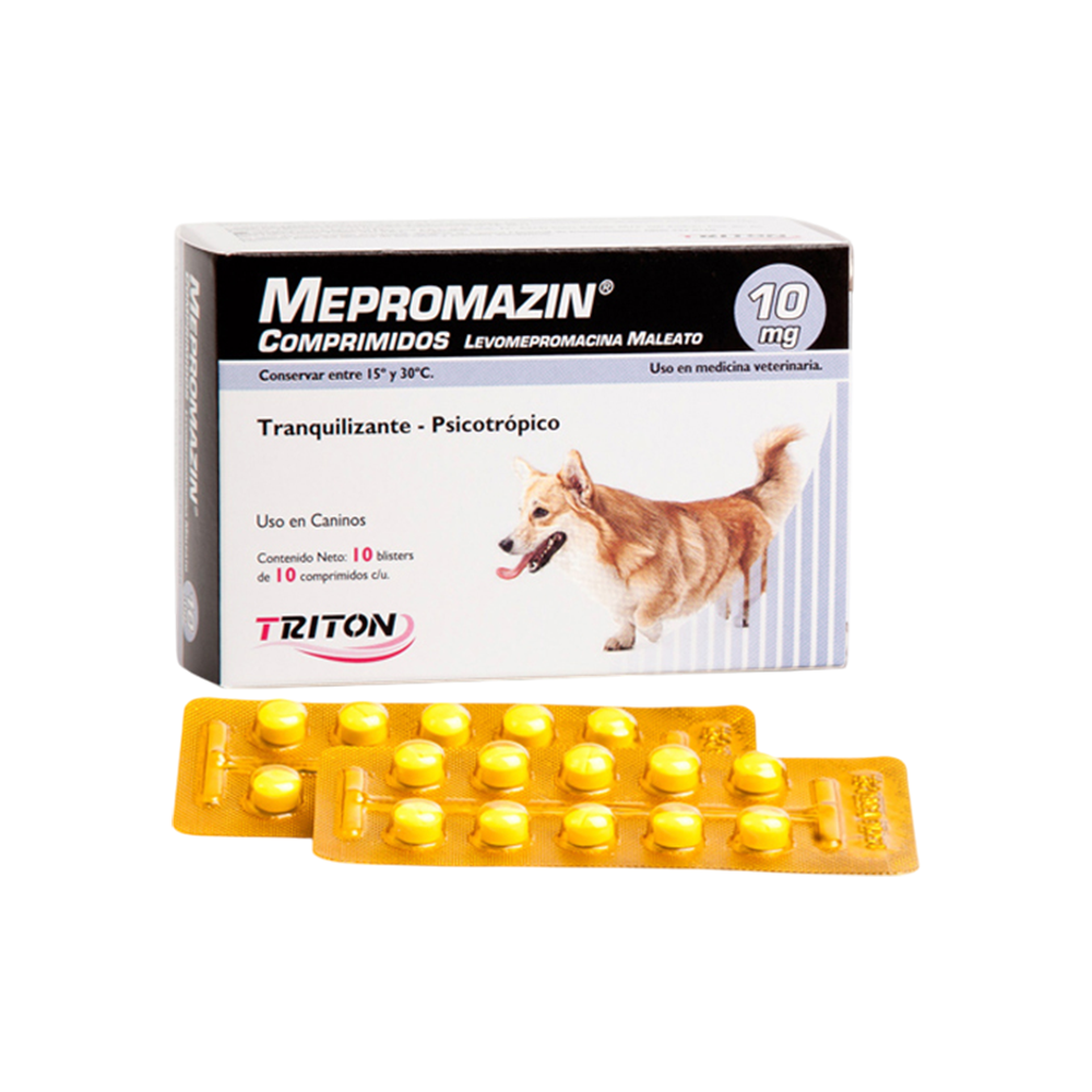 Mepromazin de Tritón contiene levomepromazina maleato 10 mg, un neuroléptico tranquilizante y psicotrópico para el control de ansiedad, agresividad, hiperactividad y otros trastornos conductuales en perros. También se utiliza como premedicación anestésica y antiemético. Su presentación de 10 comprimidos (blísteres de 10) permite tratamientos específicos bajo supervisión veterinaria para modificación del comportamiento y sedación.