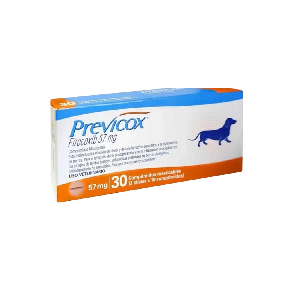 Previcox 57 mg contiene firocoxib, un AINE selectivo de COX-2 diseñado para el manejo del dolor y la inflamación en perros pequeños y medianos con osteoartritis. También controla el dolor postoperatorio en cirugías ortopédicas y de tejidos blandos. Los 30 comprimidos masticables con sabor permiten una administración oral fácil, mejorando la movilidad y calidad de vida del paciente.