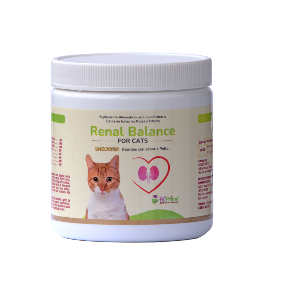 Renal Balance For Cats de Pet Prime es un suplemento nutricional en nuggets blandos sabor pollo, formulado para apoyar la función renal en gatos de todas las razas y edades con enfermedad renal crónica o en riesgo. Sus ingredientes ayudan a reducir la carga tóxica renal, mejorar la filtración glomerular y mantener el equilibrio electrolítico. Presentación de 60 nuggets palatables para administración diaria.