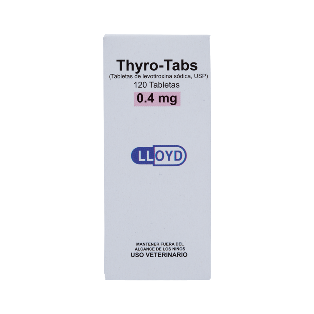 Thyro Tabs de Lloyd es una terapia de reemplazo hormonal con levotiroxina sódica 0,4 mg (USP) para el tratamiento del hipotiroidismo en perros y gatos. Su presentación de 120 tabletas garantiza un tratamiento prolongado y estable, restaurando los niveles normales de hormona tiroidea, mejorando el metabolismo, la función cardíaca, el estado del pelaje y el nivel de energía del animal.