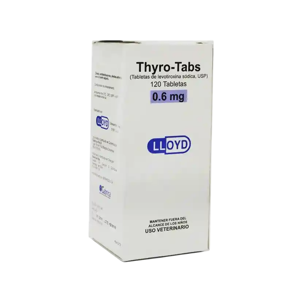 Thyro Tabs 0,6 mg de Lloyd contiene levotiroxina sódica (USP) para la terapia de reemplazo hormonal en perros con hipotiroidismo. Su presentación de 120 tabletas permite un tratamiento continuo y ajustado, restaurando los niveles normales de hormona tiroidea, mejorando el metabolismo, la termorregulación, el estado del pelaje y la calidad de vida del paciente con déficit tiroideo crónico.