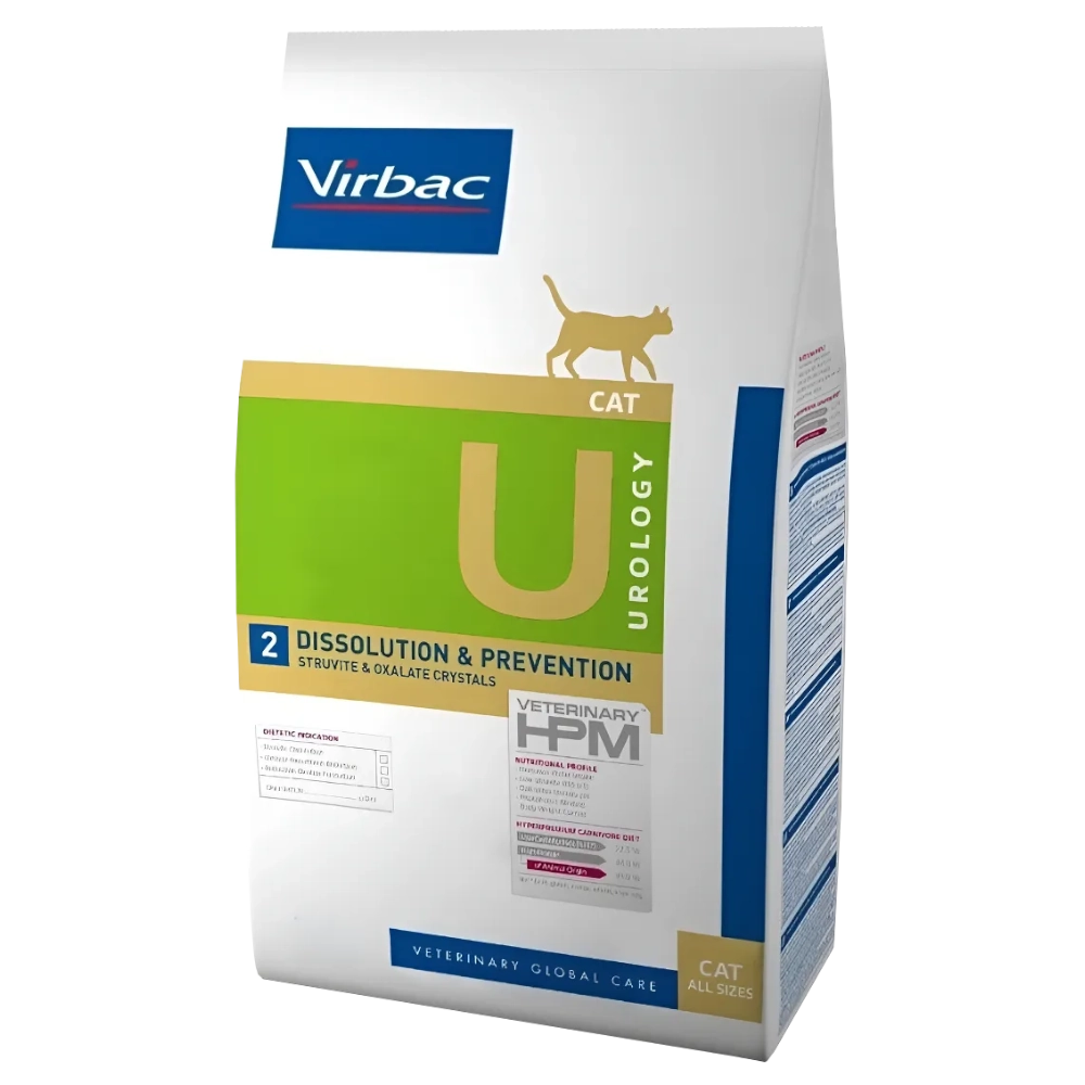 Alimento seco Virbac HPM Urology Dissolution & Prevention U2 1.5 kg, formulado para apoyar la disolución y prevención de cálculos urinarios (estruvita y oxalato). Con 44% de proteína de alta calidad, fibras que favorecen la digestión y nutrientes que ayudan a mejorar la salud urinaria integral.