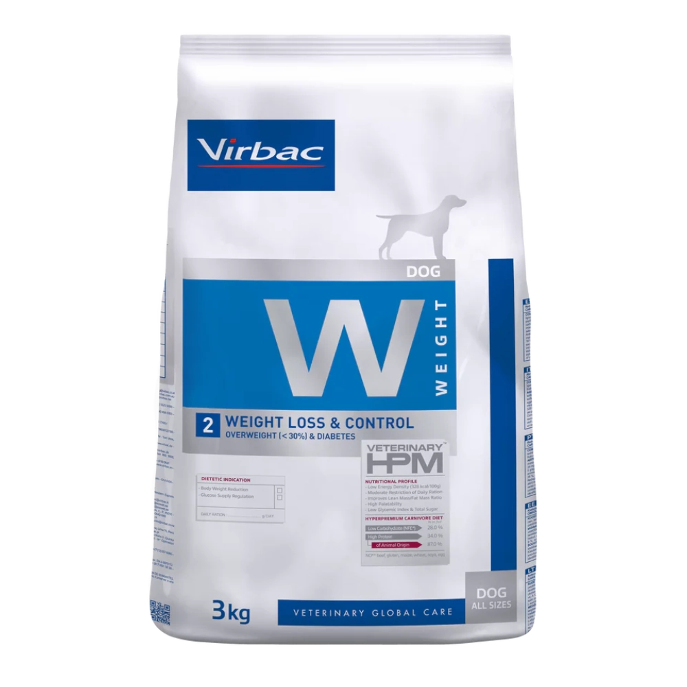 Alimento seco Virbac HPM Dog Weight Loss & Control 3 kg, formulado para perros adultos con sobrepeso u obesidad. Bajo en calorías y grasas, alto en fibra para promover saciedad y enriquecido con L-carnitina para apoyar el metabolismo de las grasas y la pérdida de peso.