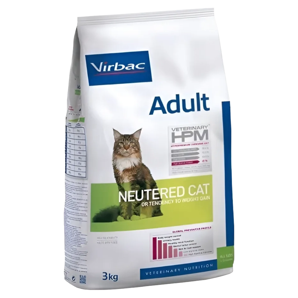 Alimento seco Virbac Veterinary HPM Adult Neutered Cat 1.5 kg, formulado para gatos adultos esterilizados. Ayuda a controlar el peso corporal, favorece una función renal saludable, respalda la salud urinaria y aporta nutrientes esenciales para el cuidado del pelaje y la piel.